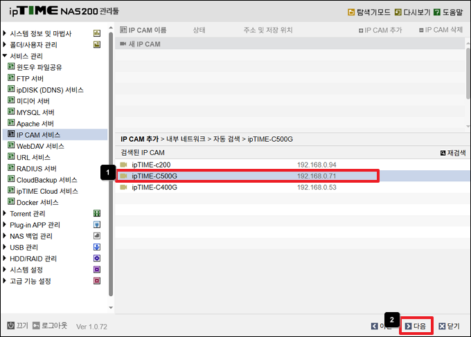 ⓛ 화면에 검색된 IP CAM 목록 중, NAS에 등록할 카메라를 선택합니다.
