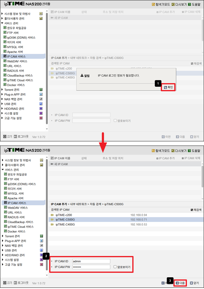 ① "IP CAM 로그인 정보가 필요합니다"라는 메시지가 표시되면, [확인] 버튼을 클릭합니다.
