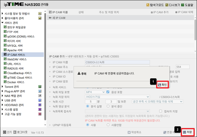 9) [IP CAM에 연결에 성공하였습니다] 팝업 창이 나타나면 [확인]을 클릭 후 오른쪽 하단의 [저장] 버튼을 클릭합니다.