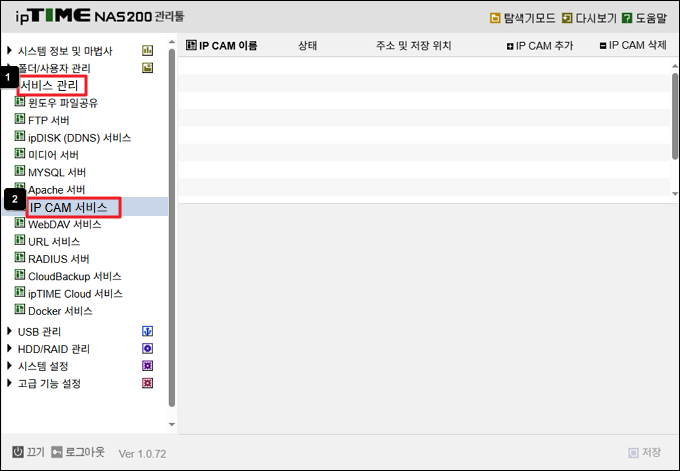 2) 서비스관리-> IP CAM 서비스 메뉴에 접속합니다.