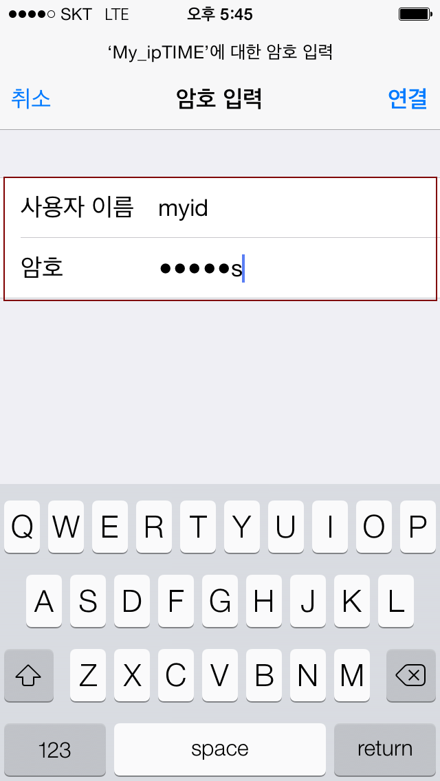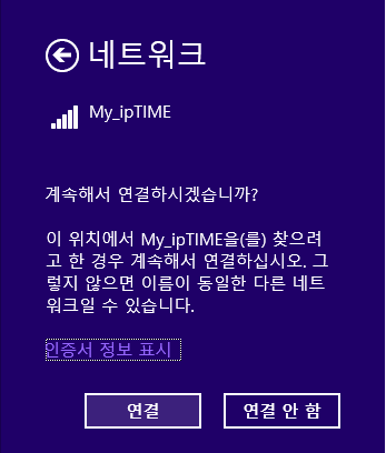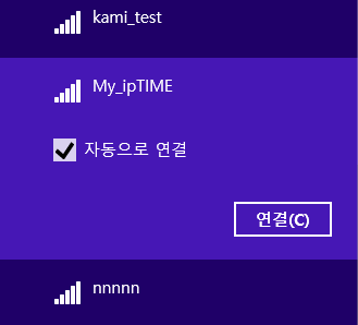 4) 아래의 창에서 “연결" 버튼을 클릭합니다. | 5) My_ipTIME으로 연결됨을 확인합니다. |