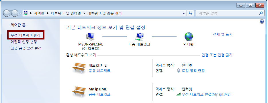 “네트워크 및 공유 센터 열기”를 열고 ”“무선네트워크관리 “를 클릭합니다.