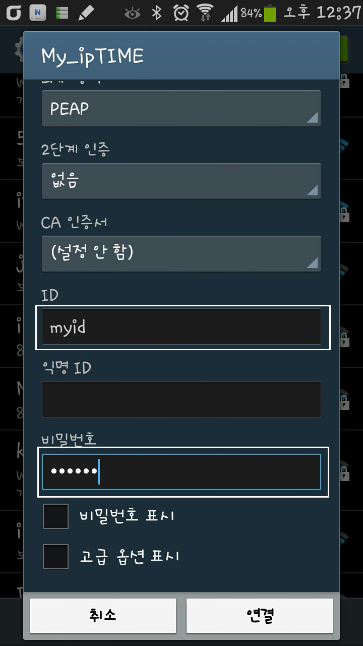 2) 기업용 설정(802.1x)를 체크박스를 체크한 후, 아래의 값을 입력합니다.