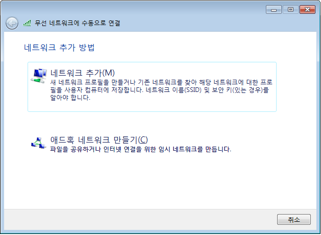 2) 무선 네트워크 관리 화면에서 “추가" 버튼 을 클릭한 후, 다음 화면에서 “네트워크 추가"를 클릭합니다.