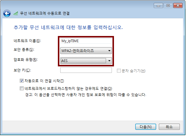 (네트워크 이름 : My_ipTIME/ 보안종류 : WPS2-엔터프라이즈 / 암호화 유형 : AES)