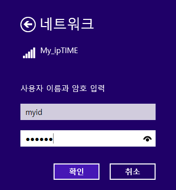 2) 연결할 무선 네트워크 이름을 선택 후, “연결" 버튼을 클릭합니다. (본 설명서에서는 “My_ipTIME” 입니다.) | 3) 등록된 사용자 이름 및 암호를 입력한 후, “확인" 버튼을 클릭합니다. ( 본 설명서에서 사용자이름은 “myid” 암호는 “mypass” 입니다.) |